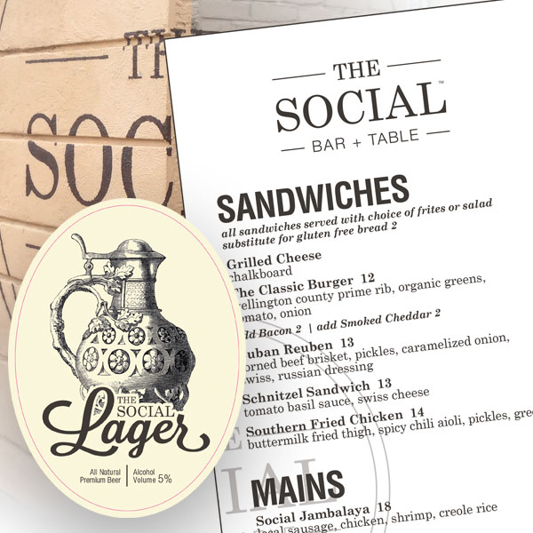 While creating the identity for The Social, we pulled our inspiration from Victorian era illustrations and vintage letterpress designs. The branding was developed to have a vintage industrial feel, maintaining a harmony of white space through all the mediums. Our imagery utilizes highly detailed, hand illustrations paired with a simple colour palette.